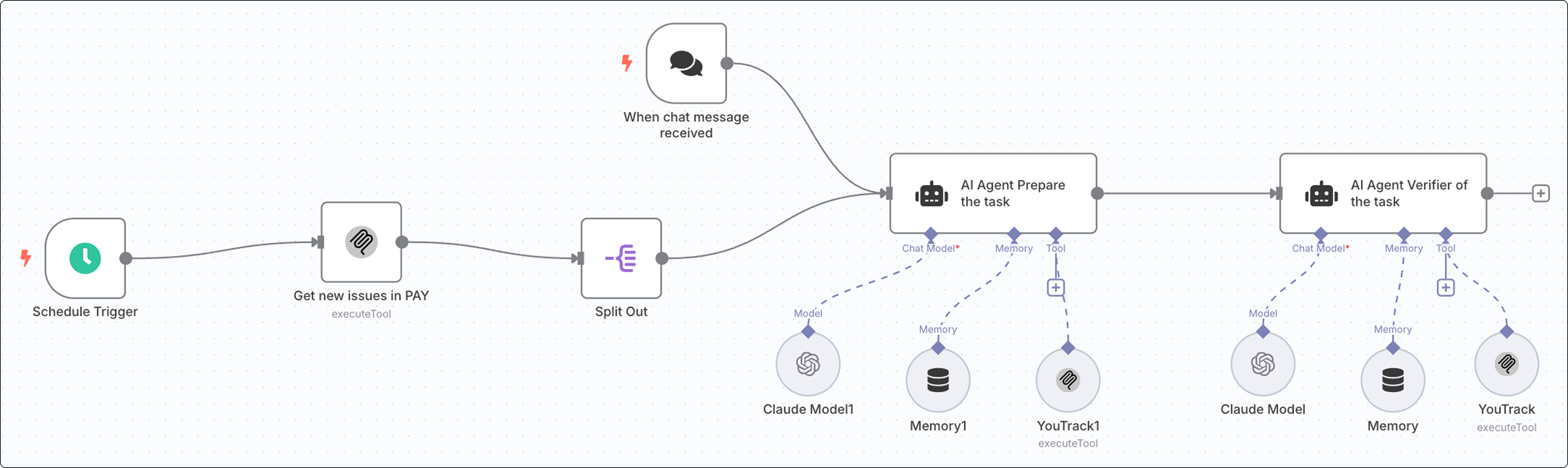 A simple but effective automation was implemented to review finance-related tasks each day. Built with a no-code platform and connected to YouTrack, the workflow automates the identification and verification of open issues in a dedicated queue.